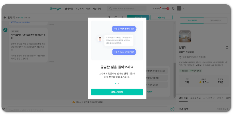 🔹견적서를 발송한 고수에게 무료로 상담을 받을 수도 있다